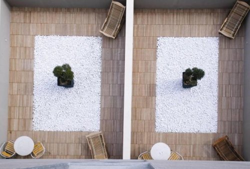 La camera Deluxe offre un terrazzo privato di ispirazione zen, arredato con lettini prendisole.
