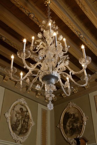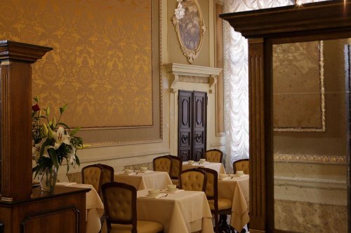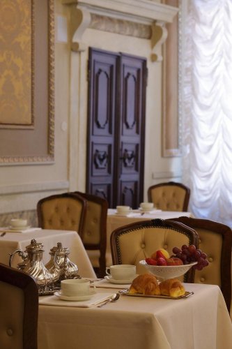 La Sala dei Putti, dove viene servita la prima colazione a buffet, dispone di soffitti altissimi con travi originali e finemente decorate a mano, damaschi e affreschi alle pareti e due preziosissimi lampadari originali di Murano.
