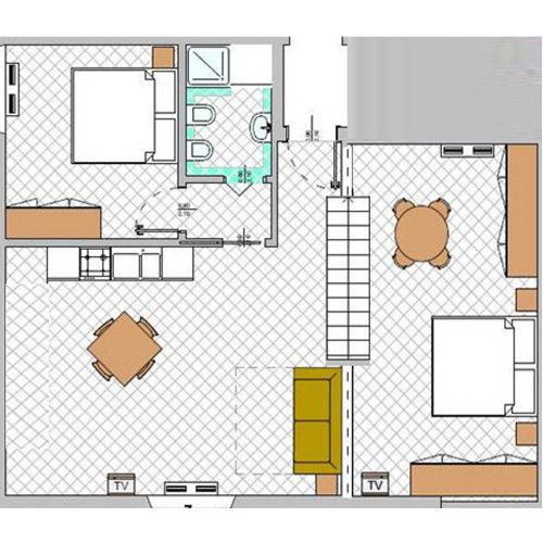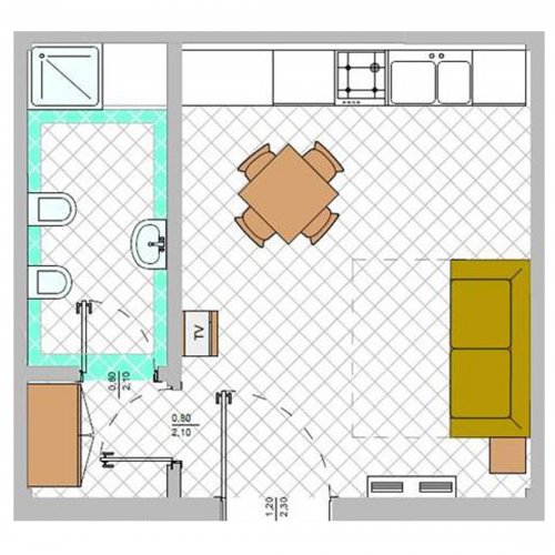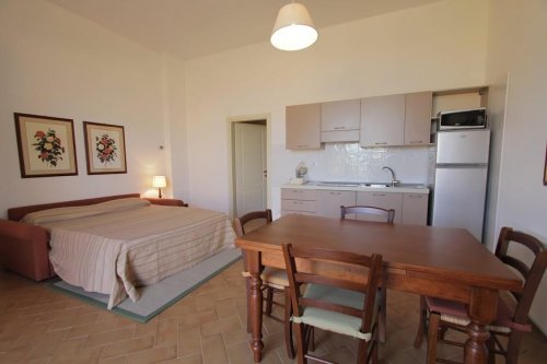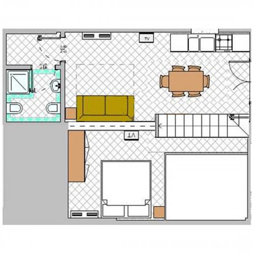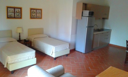 Il Monolocale si compone di soggiorno/cucina con divano letto matrimoniale, servizi privati con doccia.