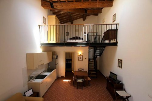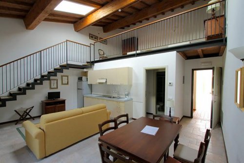 Appartamento per 4 persone composto da soggiorno/cucina con divano letto matrimoniale, soppalco con 2 letti singoli o letto matrimoniale, servizi privati con doccia.