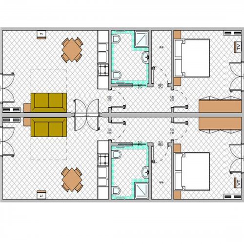 Camera quintupla: Si tratta di un appartamento per 5 persone di ca 70 mq con due ingressi indipendenti, composto da: soggiorno con angolo cottura con 2 Letti singoli o 1 matrimoniale (su disponibilità) oppure divano letto matrimoniale, comunicante con un altro appartamento composto da: soggiorno cucina con angolo cottura, divano letto matrimoniale, 1 pouf/Letto singolo, due bagni, 2Tv, doppio balcone e doppio gazebo (su disponibilità). In questa tipologia di camera non si accettano animali.