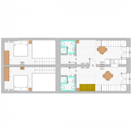 Appartamento per 8 persone disposto su due piani di ca.85 mq e così composto: al primo piano due soggiorni, cucina e divano letto matrimoniale; due camere con letto matrimoniale e due bagni con doccia; area verde con gazebo