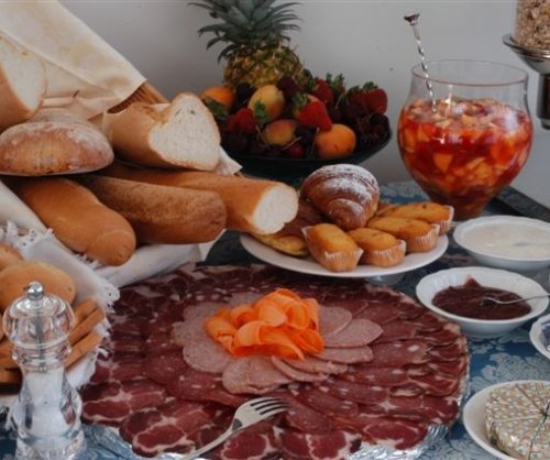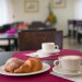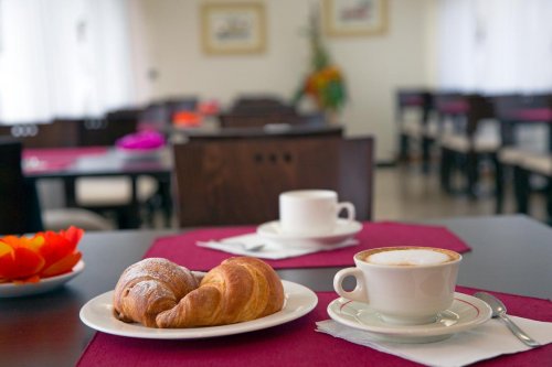 La colazione viene servita nell'apposita sala con un ricco buffet di crostate, brioches, confetture, miele, nutella, yogurt, cereali, succhi, ampia scelta di tè, frutta fresca e sciroppata, salumi, formaggi, prodotti dietetici.