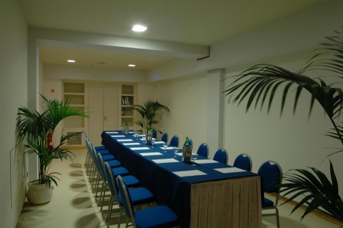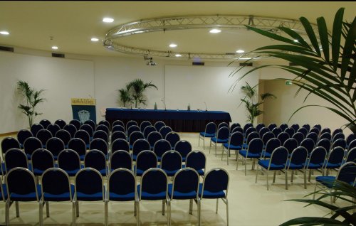 La Sala convegni di 200 mq può accogliere fino a 120 persone ed è attrezzata con impianti audiovisivi, lavagna luminosa, lavagna a fogli mobili.
