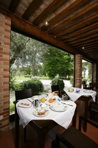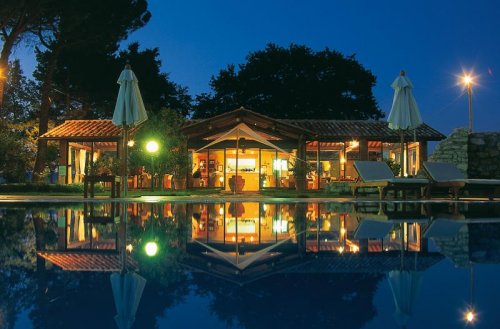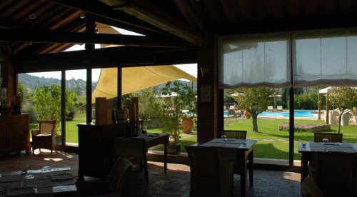 Il ristorante è situato al centro del parco, in posizione panoramica di fronte alla piscina, con vista sul piccolo borgo medievale di Montemerano.