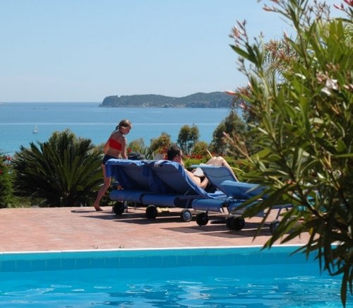 - Bilocale "Azalea" da 4 posti letto, con camera da letto matrimoniale, soggiorno arredato con 2 divani letto, angolo cottura attrezzato, forno a microonde, frigorifero e freezer, 2 bagni, veranda con vista panoramica sul mare.