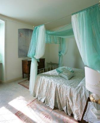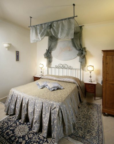 Camera matrimoniale Frate Foco composta da letto matrimoniale a baldacchino, caminetto, tavolo con seggiole, angolo cottura, telefono, cassaforte, asciugacapelli, Tv, bagno privato con doccia.