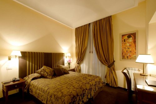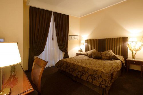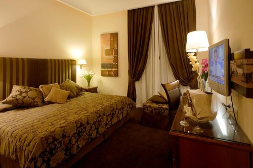 Tutte le stanze dispongono di letto matrimoniale composto da 2 letti uniti, 2 comodini, scrivania, sedia, puff, frigobar, armadio, aria condizionata, TV color al plasma.