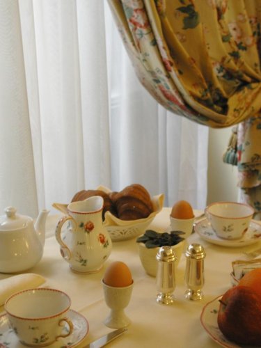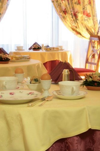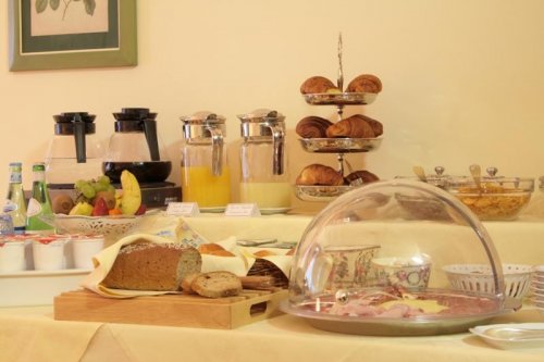 L'accogliente Sala per le colazioni in "stile inglese" offre al mattino un ricco buffet con caffé, the, latte, succhi di frutta, pane bianco e integrale, croissant, marmellate, burro, miele, yogurt, cereali, affettati misti e formaggi, uova, torte e un piccolo angolo di prodotti dietetici.