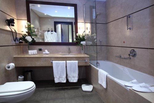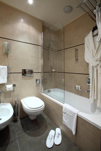 La maggior parte delle camere dispone di arredi con tappezzerie in velluto grigio, mobili in tonalità crema, moquette grigio-bordeaux e bagni con pavimenti di mattonelle in terracotta.