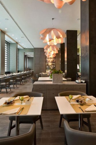 L'atmosfera è resa unica dagli eleganti arredi, dagli alti lampadari realizzati in foglia di legno sottile e dai giochi di luce che creano effetti cromatici differenti nei vari momenti della giornata.