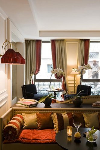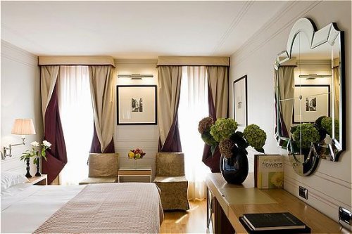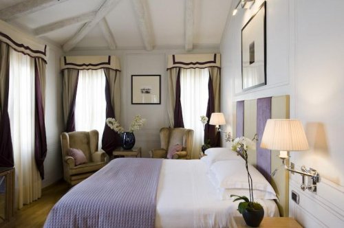 L'interior design dal taglio contemporaneo, emerge nel grigio perla delle pareti, nei decori glicine dipinti a mano, e nei colori dei velluti e delle sete presenti nelle testate dei grandi letti e nei sofà.