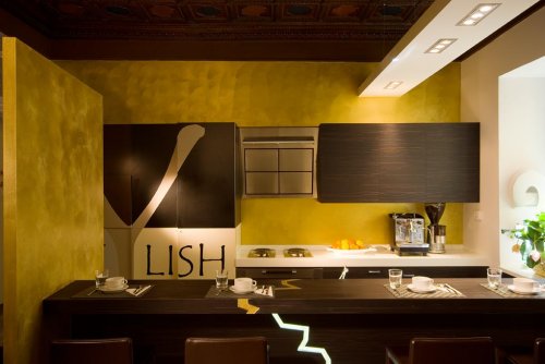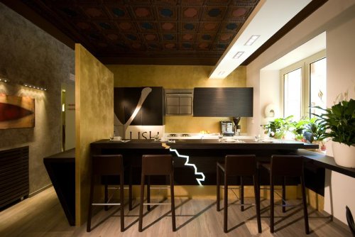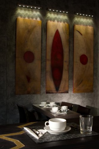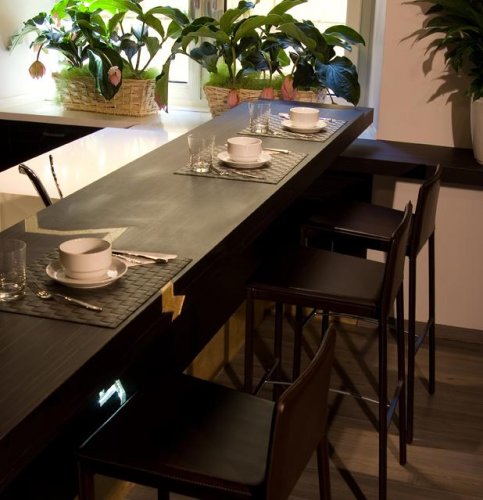 Un moderno bancone stilizzato divide la cucina dai tavoli apparecchiati, creando confidenza con il personale e riscoprendo il gusto di assistere alla preparazione dei piatti.