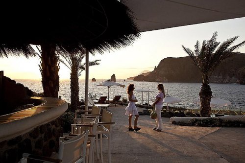 Il Lounge Bar “Faraglioni”, ideale per sorseggiare un cocktail o un aperitivo prima di cena, diventa un teatro a cielo aperto da cui ammirare lo spettacolo del tramonto su Alicudi e Filicudi.