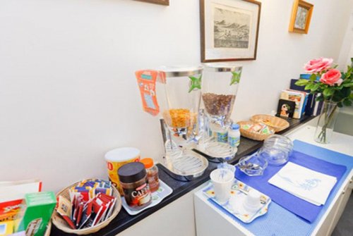 - colazione “fai da te”, composta da caffè in cialde, latte, thè, camomilla, tisane dai vari gusti, spremuta d'arancia fresca, succhi di frutta, cereali, cornetti, biscottini, fette biscottate, marmellata, burro, nutelline, yogurt, frutta di stagione;