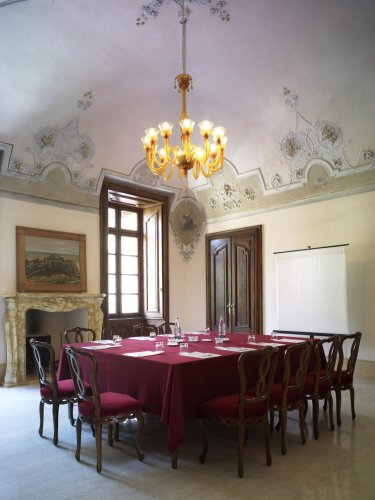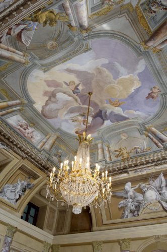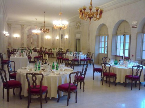 La proprietà vanta ricchi interni, pavimenti in marmo, corridoi lunghi e spaziosi, soffitti alti, lampadari e affreschi che creano un'atmosfera di sontuosità.