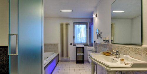 La raffinata Suite offre un'ampia zona notte con letto a baldacchino, cabina armadio e pavimento in parquet, bagno con vasca idromassaggio e ampia doccia con soffione, ricercata linea di porcellane con raffinato set cortesia.