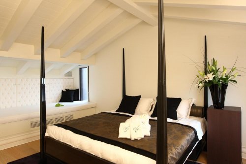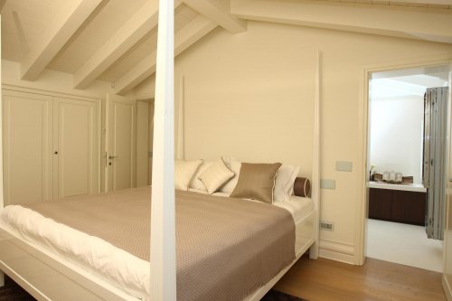Al piano superiore trovano spazio le due camere mansardate e travate a vista, entrambe con un moderno letto a baldacchino appositamente realizzato su disegno, TV color LCD integrata nell’armadio, servizi privati con doccia e/o vasca.