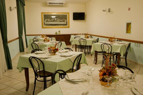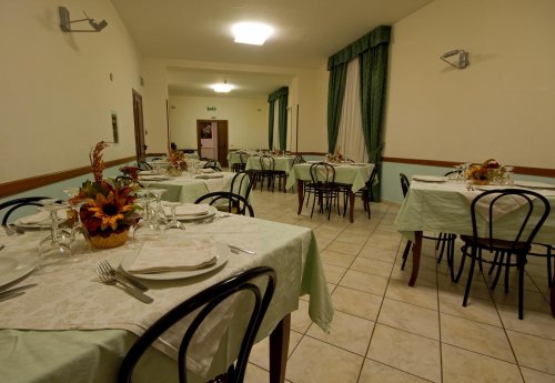 La sala da pranzo accoglie fino a 100-130 persone. Vengono proposti i principali piatti della cucina regionale e nazionale, con particolari attenzioni per sportivi, intolleranti, celiaci.