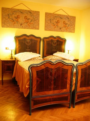 - La Suite “Melograno” si articola su 2 livelli e dispone di soggiorno con 2 divani letto, camera da letto doppia, bagno privato con doccia, pareti affrescate.