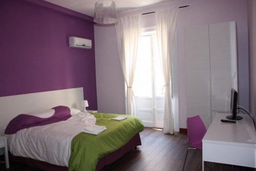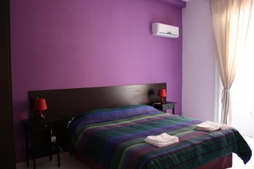 Il viola, il blu, l’arancio e il marrone, i colori del logo della struttura, sono anche i colori dominanti delle camere, disposte sui due piani gemelli del palazzo.