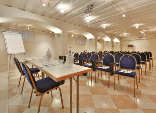 The room is equipped with a screen, a data video projector (videobeam), an amplifying system, an overhead projector, microphones, wardrobe and eco-friendly office supplies.