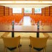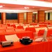 The modern conference Room has a lighted board, video projector, easel and notepad, microphone and sound system.
