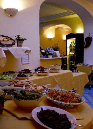La cucina propone piatti tradizionali dai tipici sapori mediterranei, menù a scelta tra diversi primi e secondi, accompagnati da un vasto buffet di contorni.