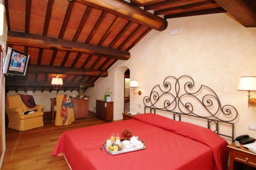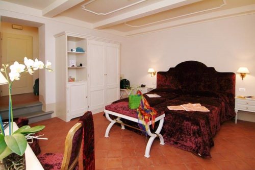 Le camere eleganti e luminose sono arredate con travi a vista e pavimenti in cotto, letti in ferro battuto e stoffe pregiate, bagni in marmo con doccia e vasca idromassaggio.