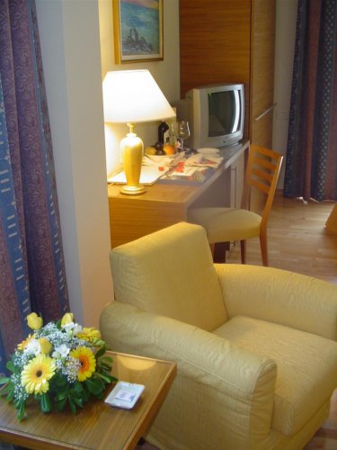 All of the rooms are air-conditioned and soundproofed and have natural parquet flooring, orthopaedic mattresses, 4 lighting programmes, sound-absorbing structures and double glazed windows guaranteeing peace and quiet, a mini-bar, a direct dial telephone, a satellite colour TV with international channels, an Internet and Intranet dedicated flow optical fibre connection, a safe-deposit box, independent air-conditioning, an en-suite bathroom with natural marble floors in various shades, a hairdryer, a shower cubicle, a towel warmer, large mirrors, thermostatic taps and an armchair with a coffee table.