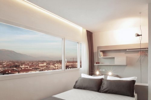 Junior Suite: large and bright, the suite is divided into two spaces, one dedicated to resting and the other - the lounge - to work and relaxation. The large window offers an extraordinary view over the hills of Marostica, its castle and the mountains of the Asiago plateau.