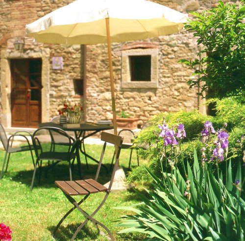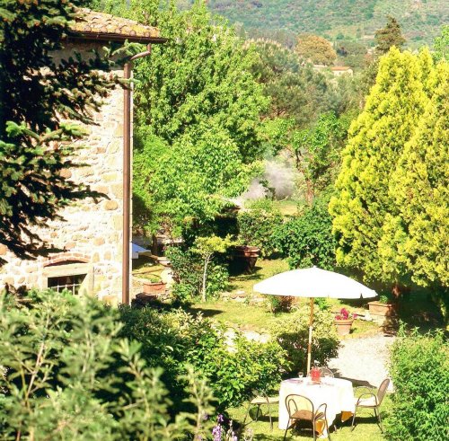 The beautiful garden has tables and chairs where guests can enjoy breakfast or dinner.
