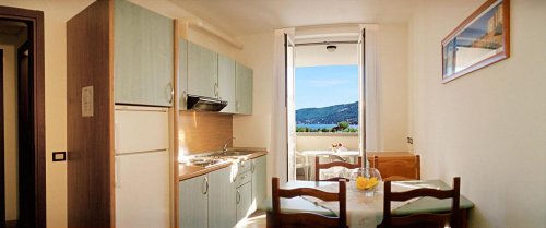 The two-room apartments for four guests measuring 33 square metres and the three-room apartments for six guests measure 47-50 square metres; they include a lovely balcony overlooking the lake.