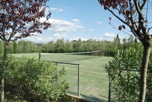 The estate grounds include a large panoramic swimming pool, a tennis court, a small playground for children and private parking for guests.