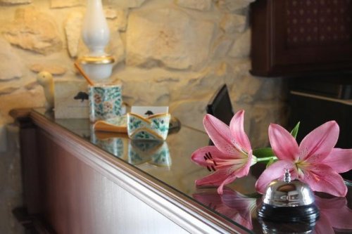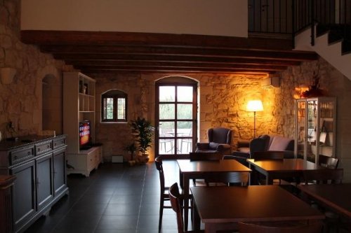 Un piccolo viale d’accesso in pietra conduce al caseggiato principale con il parcheggio, la hall, la reception e le sale comuni per la prima colazione e la cena.