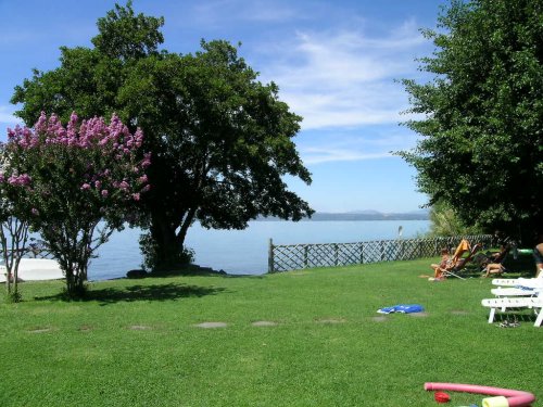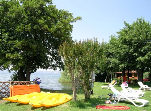 A) One-roomed flat, for two people plus a third person in an extra bed, with a private bathroom and a porch of 22 sq. m. overlooking the lake furnished with a wooden table and chairs and a sunbed.