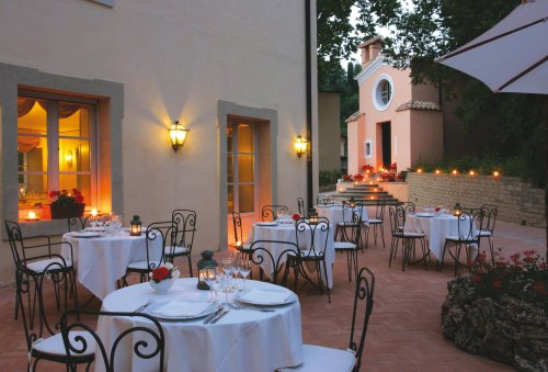 During the warm months, lunch and dinner are served on the elegant terrace by the fountain.