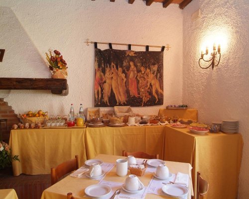 La prima colazione viene servita nella sala del caminetto affacciata sul curato giardino e propone un ricco buffet.
