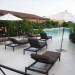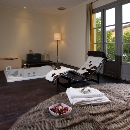 Suíte: quarto com cama de casal redonda, pátio privativo e acesso direto à piscina, vista da piscina, TV em cores com canais via satélite, conexão a Internet, minibar, ar condicionado, telefone com discagem direta, cofre, cozinha aparelhada, banheiro com ducha, Jacuzzi, roupão e secador de cabelo.