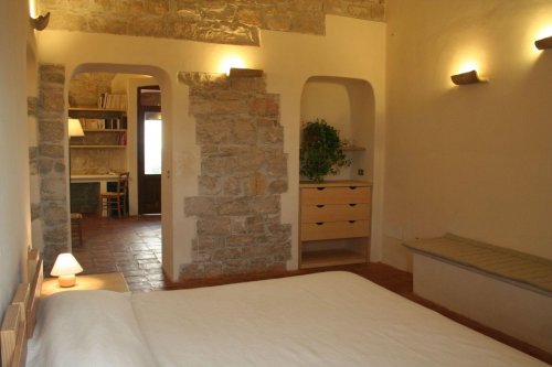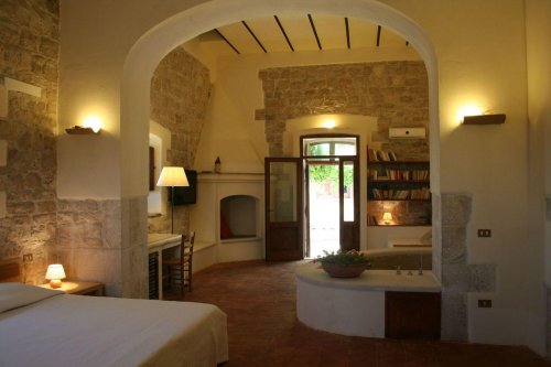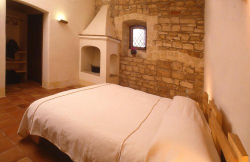 Each room features solid wood beds made from pines and olive trees or brass beds dating back to the 1800s (oriented north), mattresses in natural latex foam, sheets and towels in raw natural cotton, terracotta sinks and soaps made from olive oil.