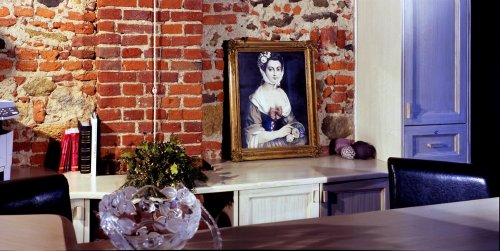 La sala si caratterizza per le pareti con mattoni a vista, il pavimento in parquet e i bellissimi soffitti con travi in legno.