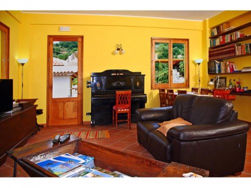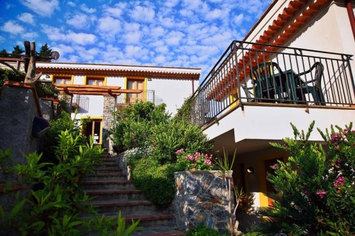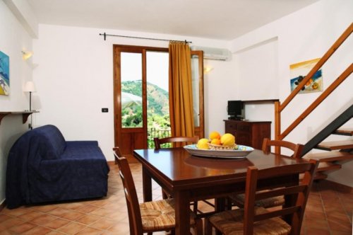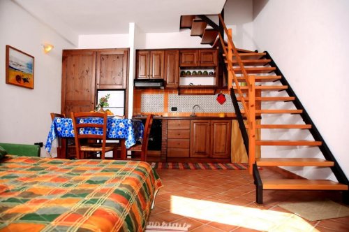 Il bilocale da 5 posti letto è un appartamento di circa 50 mq, su due livelli, con scala interna composta da una cucina/soggiorno con angolo cottura ben attrezzato (piano cottura 4 fuochi, frigorifero, congelatore, forno, pentole) e zona soggiorno con divano-letto matrimoniale, camera da letto con letto matrimoniale e letto singolo, bagno con doccia, bidet e WC, aria condizionata in tutte le camere, TV color satellitare, spazio privato esterno in lastricato di pietra, panoramico, con mobili da terrazza.