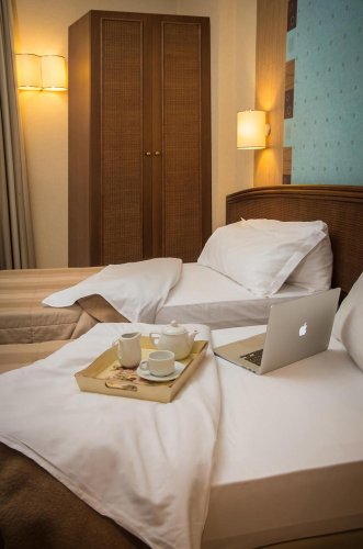 O hotel dispõe de apartamentos grandes e bem iluminados, dotados de Internet wireless, conexão Voip, TV Lcd com 10 films em avant-premiére à escolha di cliente, minibar e cofre.