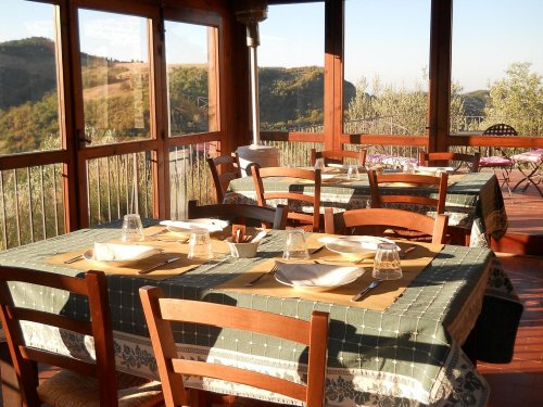 Si mangia nella sala da pranzo al tavolo comune, ma se desiderate intimità potete richiedere un tavolo separato, o sotto la veranda che domina il paesaggio circostante; nel salotto, dove ci si può accomodare in originali poltrone e divano, troneggia il pianoforte della trisavola.