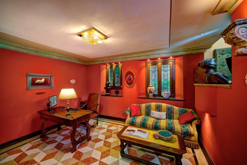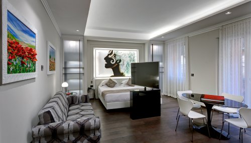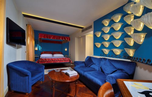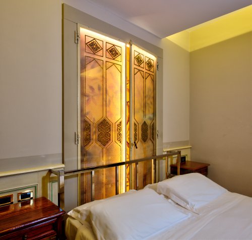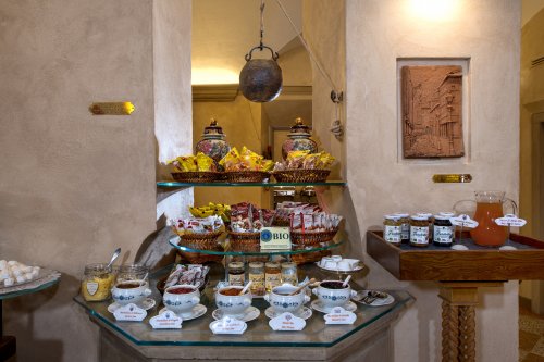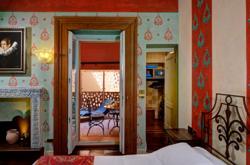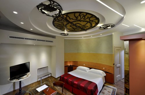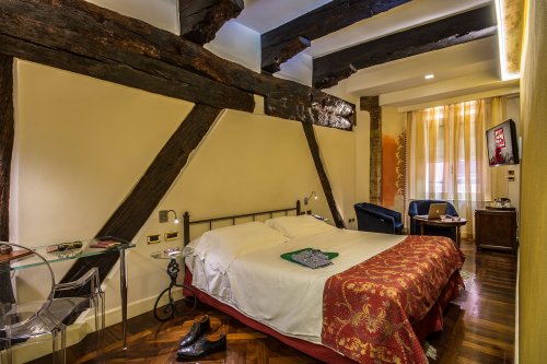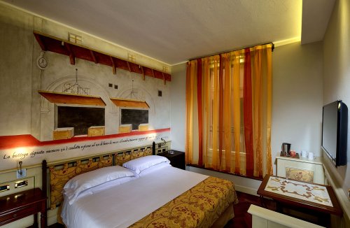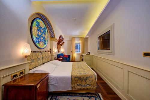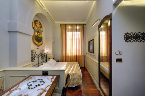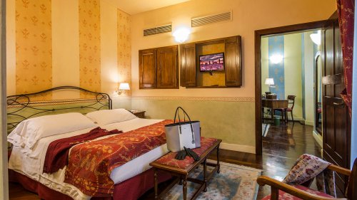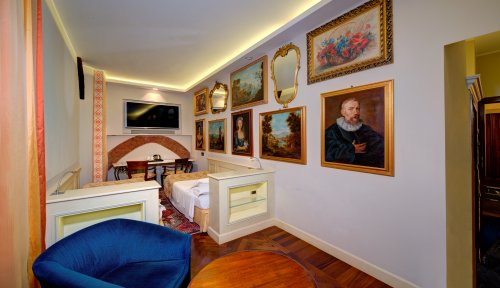 Отель располагает изысканно обставленными номерами (в том числе категории Suite), в некоторых номерах присутствуют фрески. Номера отличаются друг от друга оформлением интерьеров.