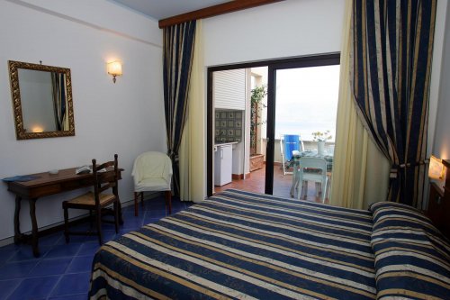 The rooms with a view of Porto di Palinuro all have a furnished terrace with a table and chairs, a washing line, and a kitchenette available for a fee to prepare meals for children.