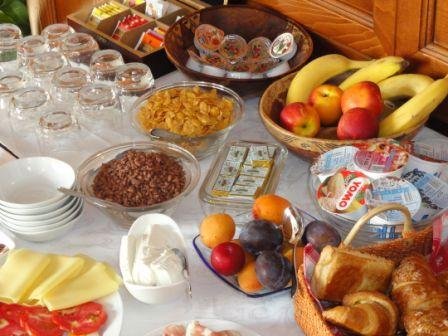 Завтрак-буфет включает круасаны, выпечку и сыры.