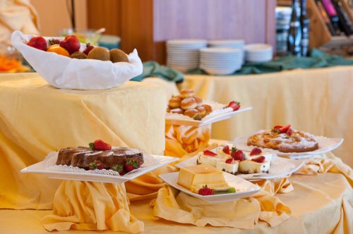 A delicious breakfast is served each morning in a welcoming sitting room decorated in pastel hues; the buffet includes pastries, jam, typical bread, local and international desserts, cereals with various types of yoghurt, fresh seasonal fruit, and sliced meats and cheeses.