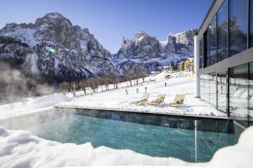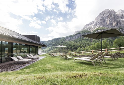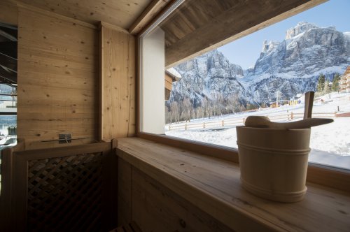 Completa l'offerta un Centro Benessere ristrutturato ed ampliato nel autunno del 2015 composto da piscina interna e piscina esterna riscaldata, nuova sala relax "Skyroom" con vista strepitosa sul Gruppo del Sella, sauna finlandese cromoterapeutica "Raja Birbal", bagno turco "Cristallo di Roccia", nuova sauna salina, nuova sauna per le famiglie e nuovi locali per trattamenti estetici e massaggi