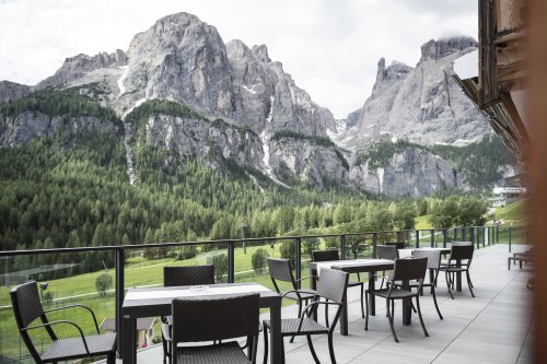 L’Hotel dispone anche di un piccolo ristorante dove poter consumare il pranzo di mezzogiorno e, durante le belle giornate, godere della terrazza con meravigliosa vista verso le montagne del gruppo Sella e le piste da sci.
